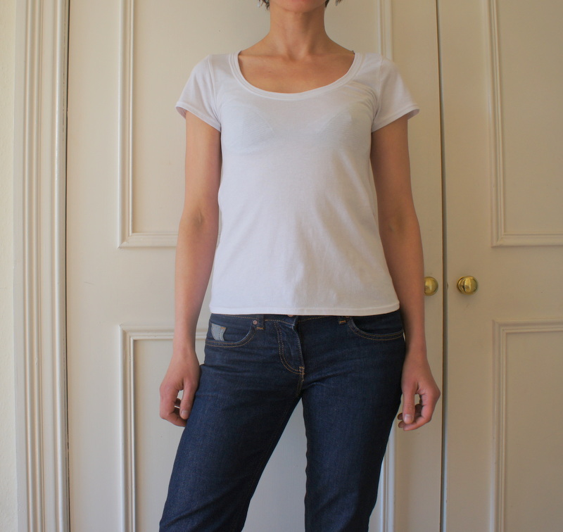 J’ai un peu repris les côtés de manière à ce que le t-shirt soit un peu moins évasé sur les hanches et j’ai inséré une bande d’entoilage pour la couture d’épaule. Bien pratique un p’tit t-shirt blanc qui passe partout!