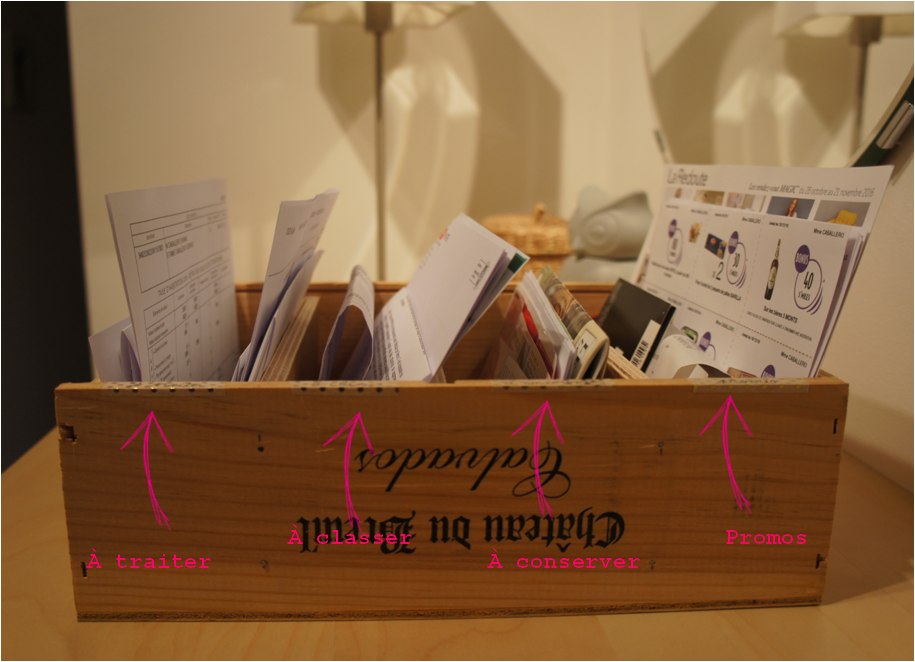 Pour le courrier, Judith propose d’avoir un endroit unique servant de réceptacle aux courriers et divers papiers. Par contre, le type de rangement qu’elle proposait ne me plaisait pas du tout, ça ressemblait à ça.