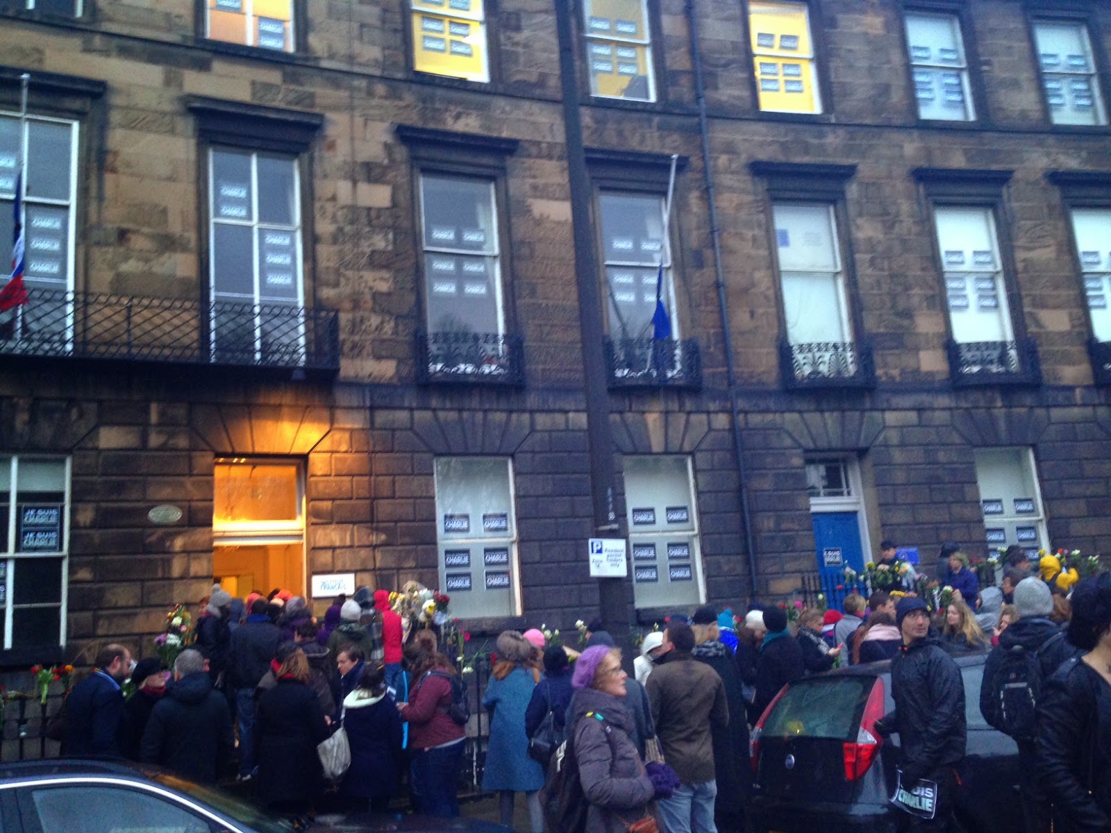 Nous nous sommes rassemblés aujourd’hui à 15h devant le consulat français à Édimbourg pour 2 minutes de silence, stylos et fleurs brandis, puis la cornemuse a retenti – nous rappelant combien France et Écosse sont solidaires 😉