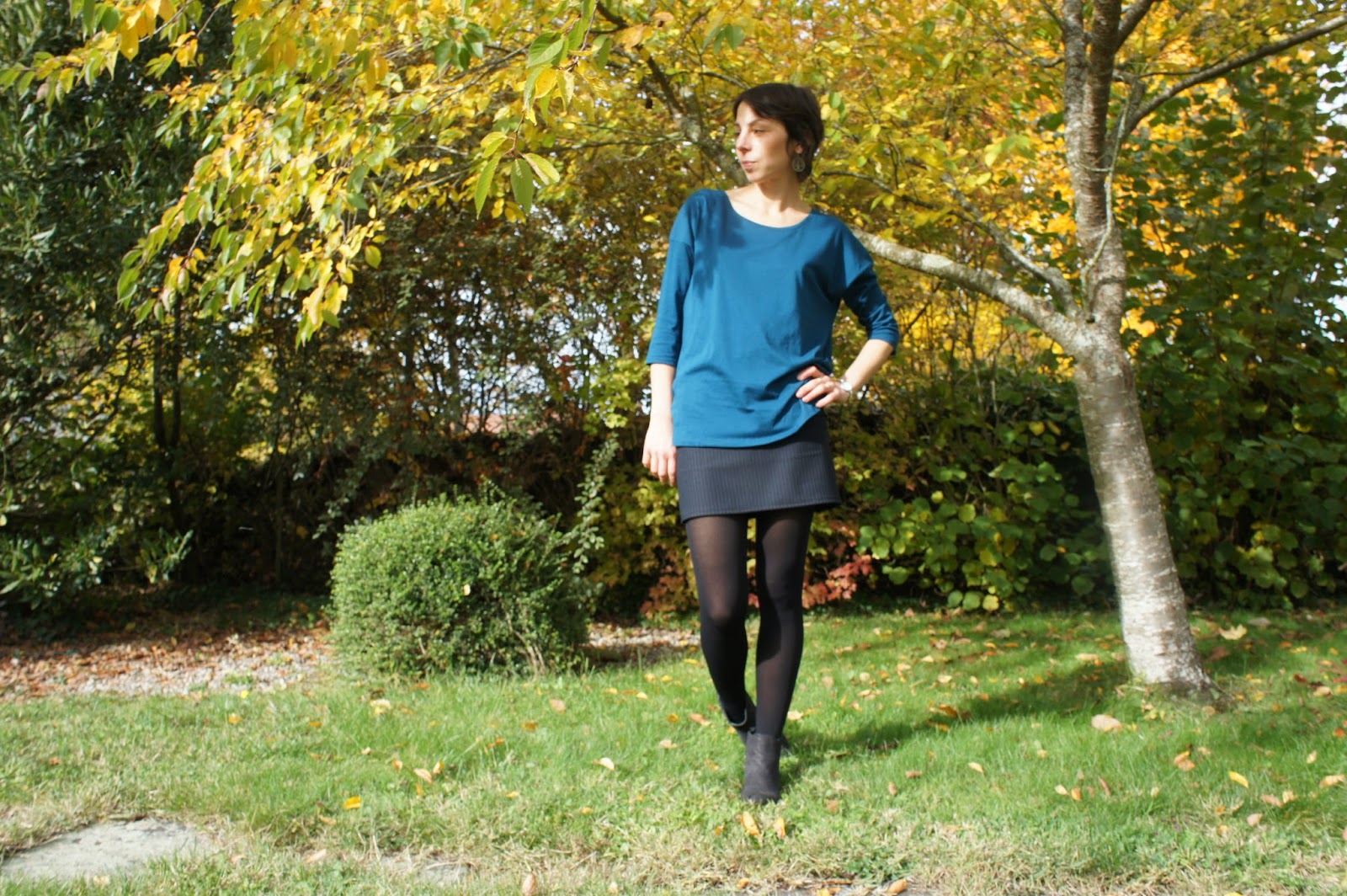 Elle est sympa, je ne la trouve pas trop courte par rapport aux commentaires que j’avais pu lire ici ou là. Il faut reconnaître que je suis petite donc ça doit aider. Le seul reproche que je peux lui faire c’est de ne pas avoir de poches et que le tissu est un peu triste… un peu marre de tout ce noir à vrai dire 🙂