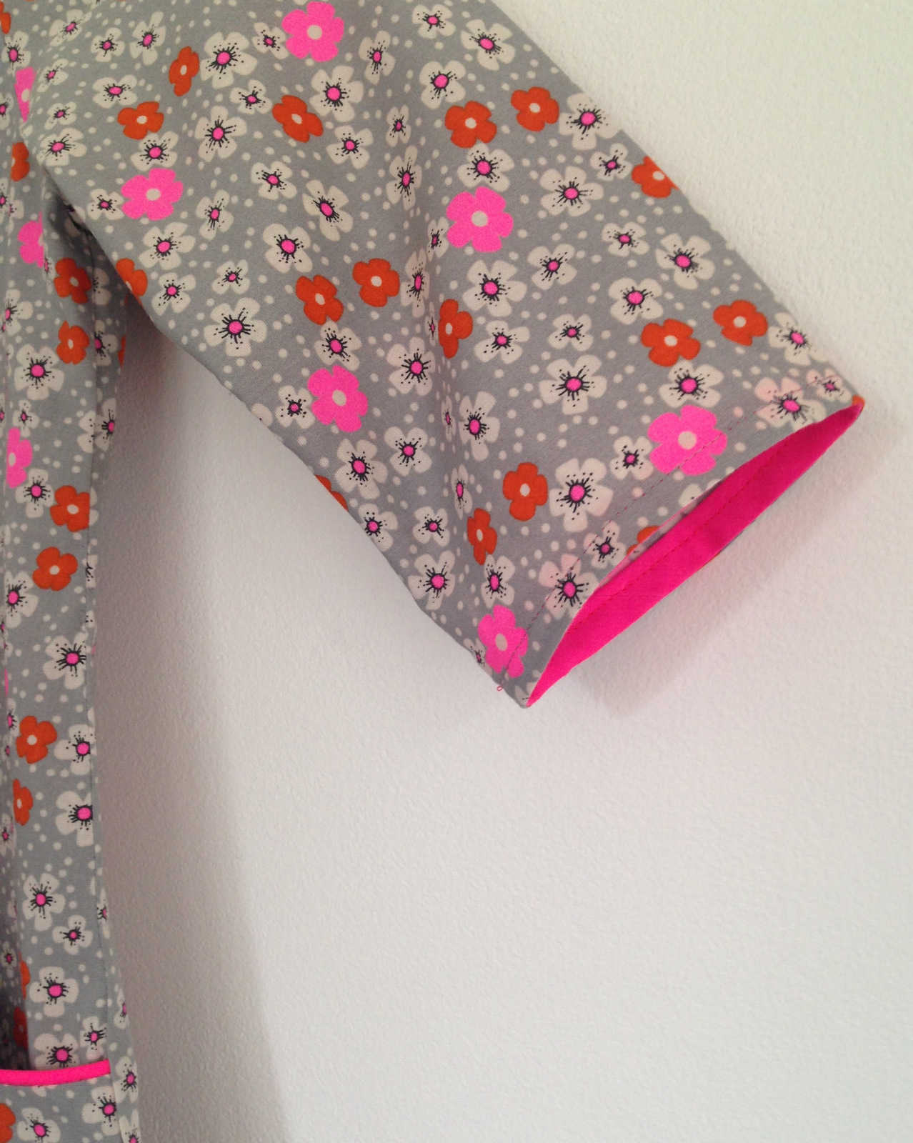 J’ai réhaussé le tissu avec un passepoil rose fluo. Les boutons « fleurs » viennent de la boutique de tissus à côté de chez mes parents. Les ourlets des manches sont réalisés avec un biais rose fluo coordonné au passepoil.