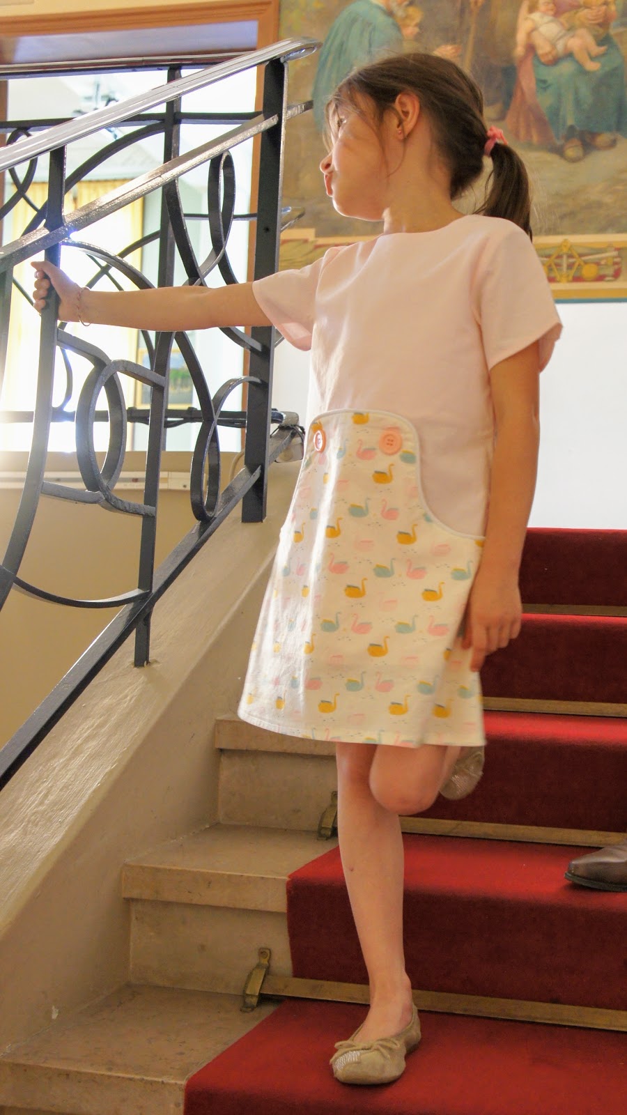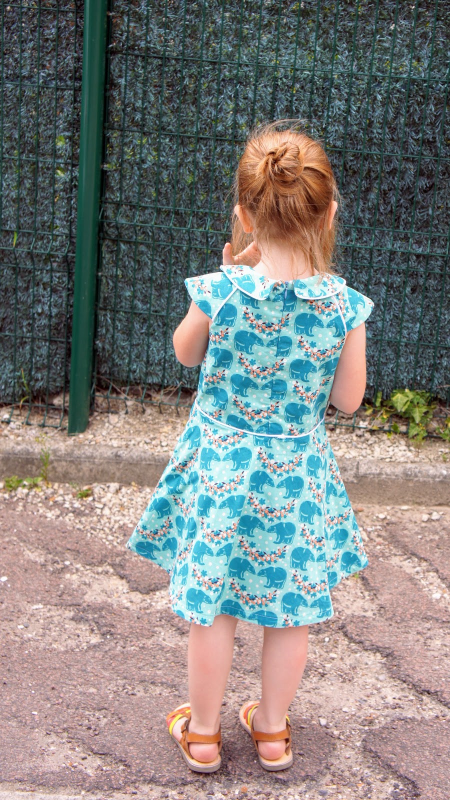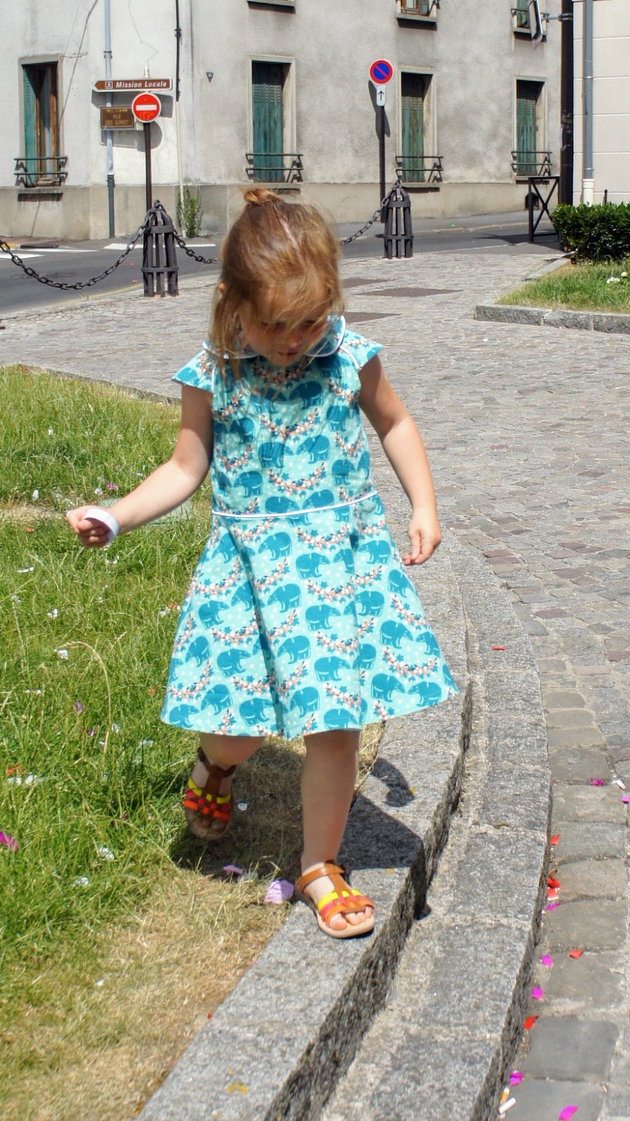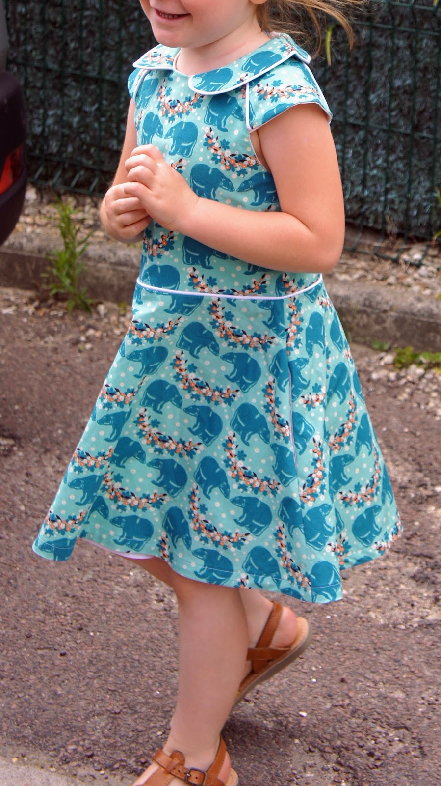 La seule différence par rapport à mes anciennes versions est le fait d’avoir utilisé deux tissus différents pour le haut et le bas de la robe et raccourci les manches.