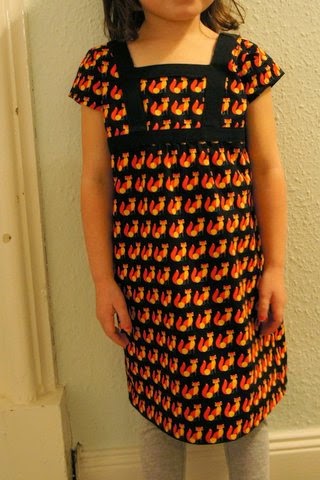 Je l’ai fait avec les restes de tissu de la doublure de la jupe Mini-perle. Je suis allée un peu vite en recopiant le patron d’où quelques soucis au montage du devant. Je me suis aussi un peu emmêlée les pinceaux en voulant faire une marge de couture à 1,5 cm au lieu d’1 cm, ce qui n’a pas simplifié l’affaire! Et il faut bien avouer que je n’étais pas plus emballée que ça à l’idée de faire une chemise de nuit donc j’aurais pu un peu plus m’appliquer, mais bon ça le fait quand même et surtout la grande est ravie!!